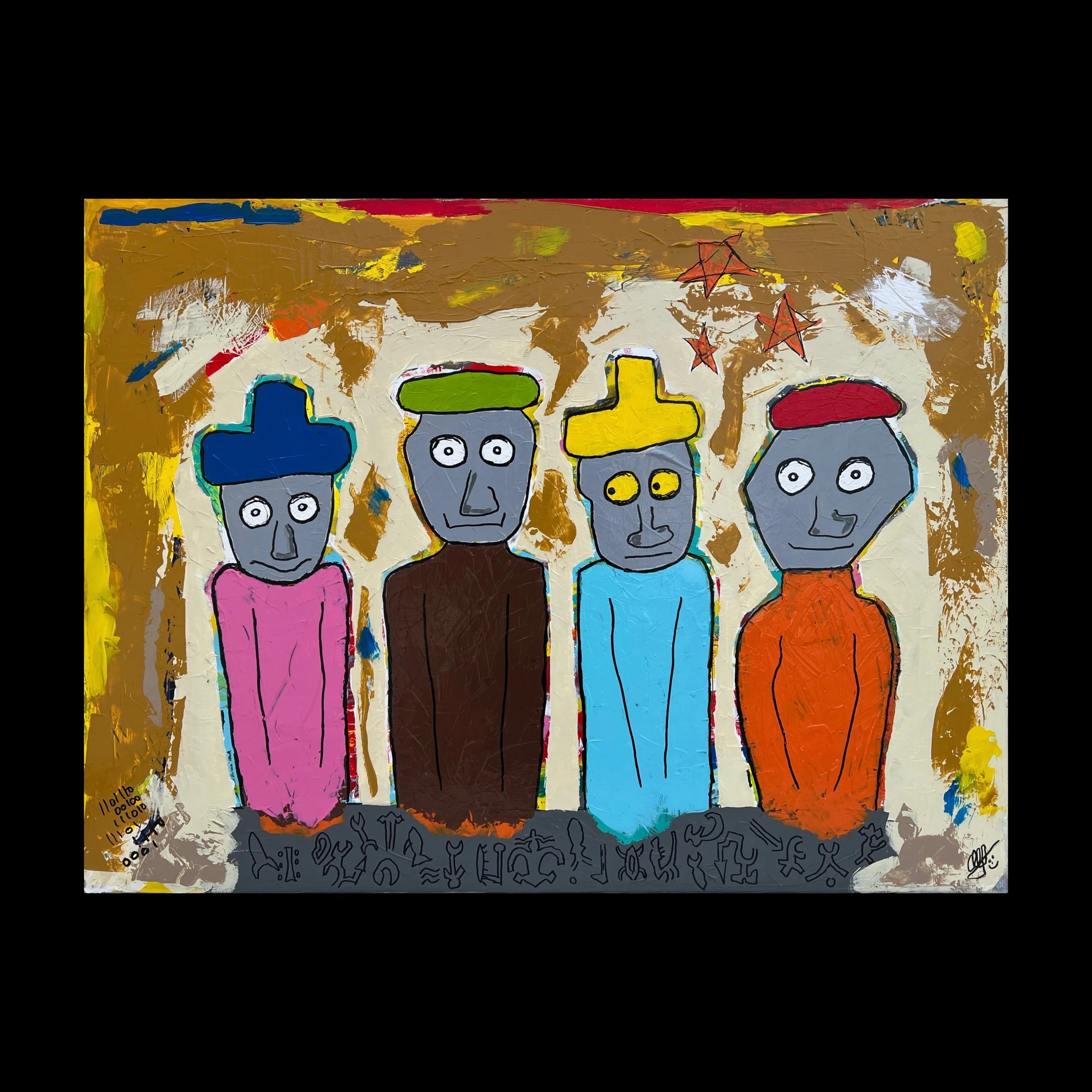 Rongorongo-tavlerne (tegnene på fundamentet) – engang bærere af betydning – blev med tiden opbevaret uden forståelse. De er her sat op ved siden af de tegn computerteknologi er baseret på 0 og 1.